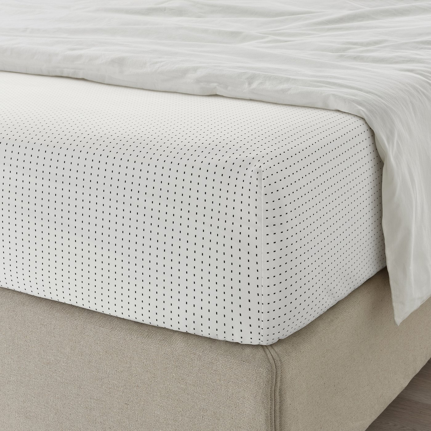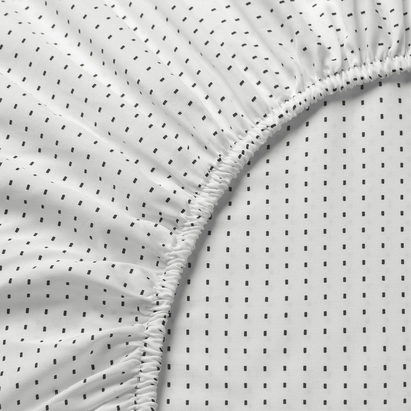 The fitted sheet fits mattresses with a thickness up to 14⅝ in. since the fitted sheet has elastic edging all around.