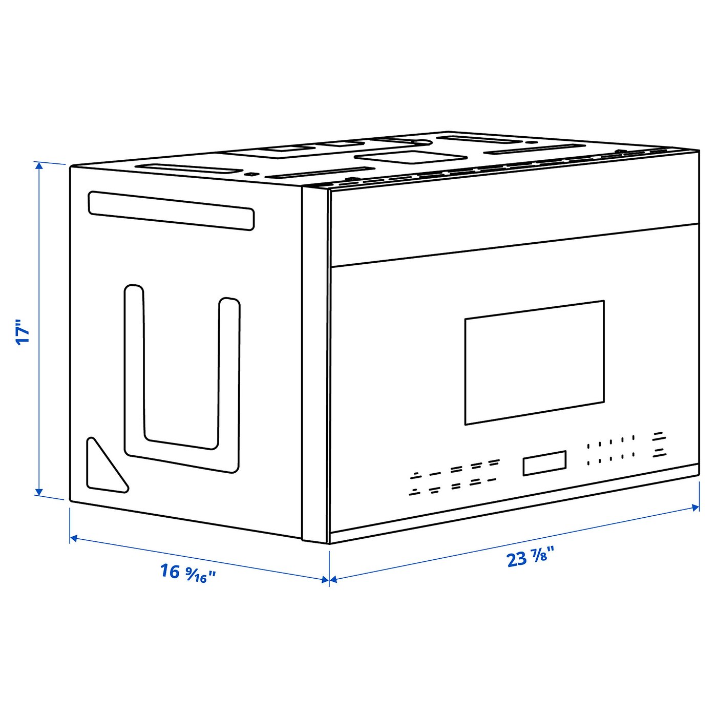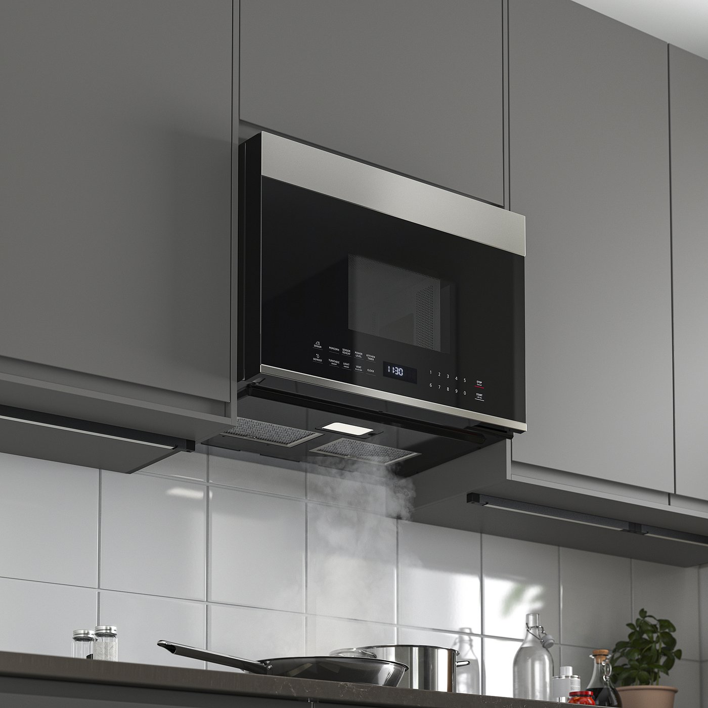 This microwave oven has a full-width door that is both sleek and increases the interior space. It is pre-set to cook at the touch of a button and multi-tasks as a range hood with 2-speed ventilation.