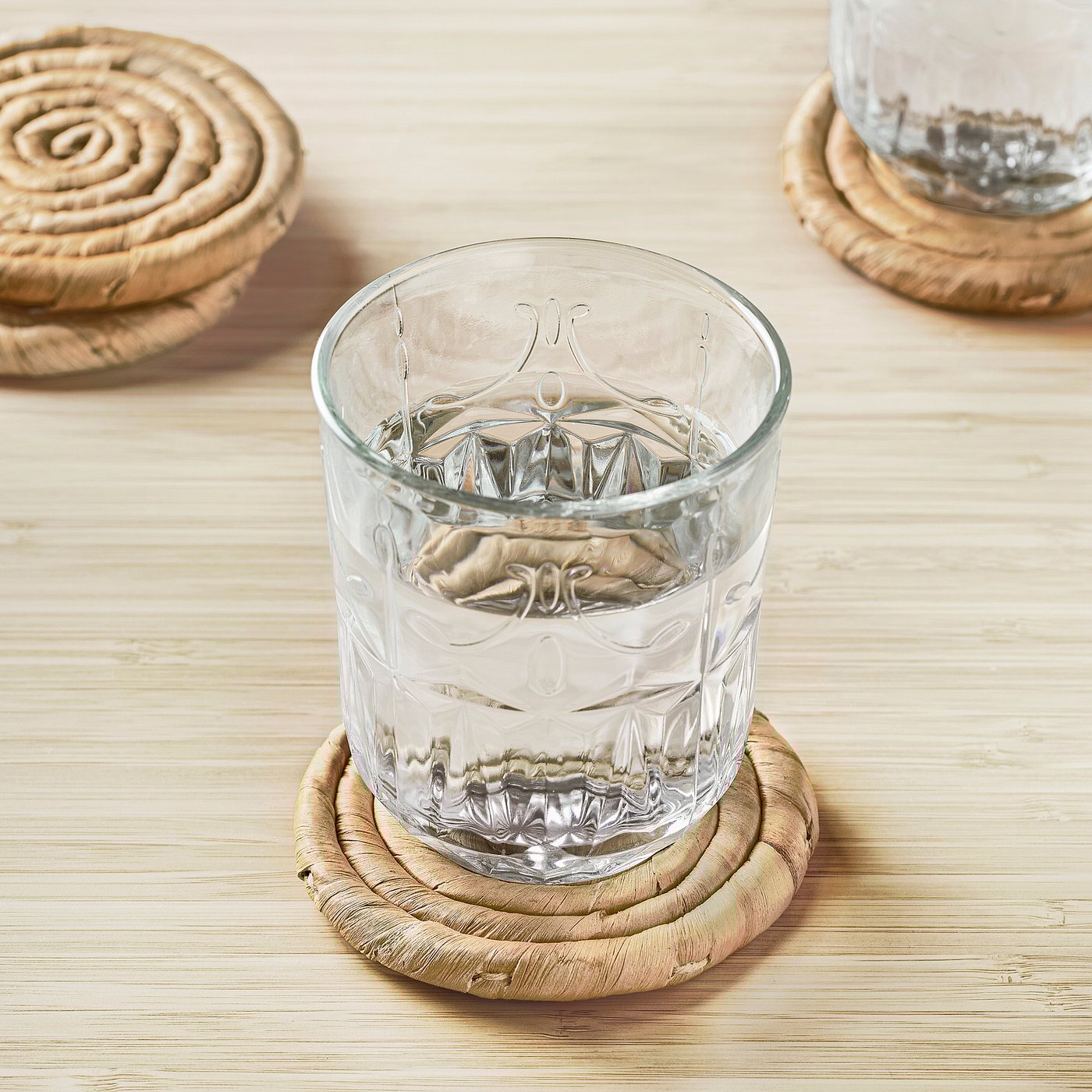Let nature decorate your dining table. These 4 coasters with their expressive pattern are handwoven from water hyacinth. A unique handicraft that spreads a calm feeling and protects the table.
