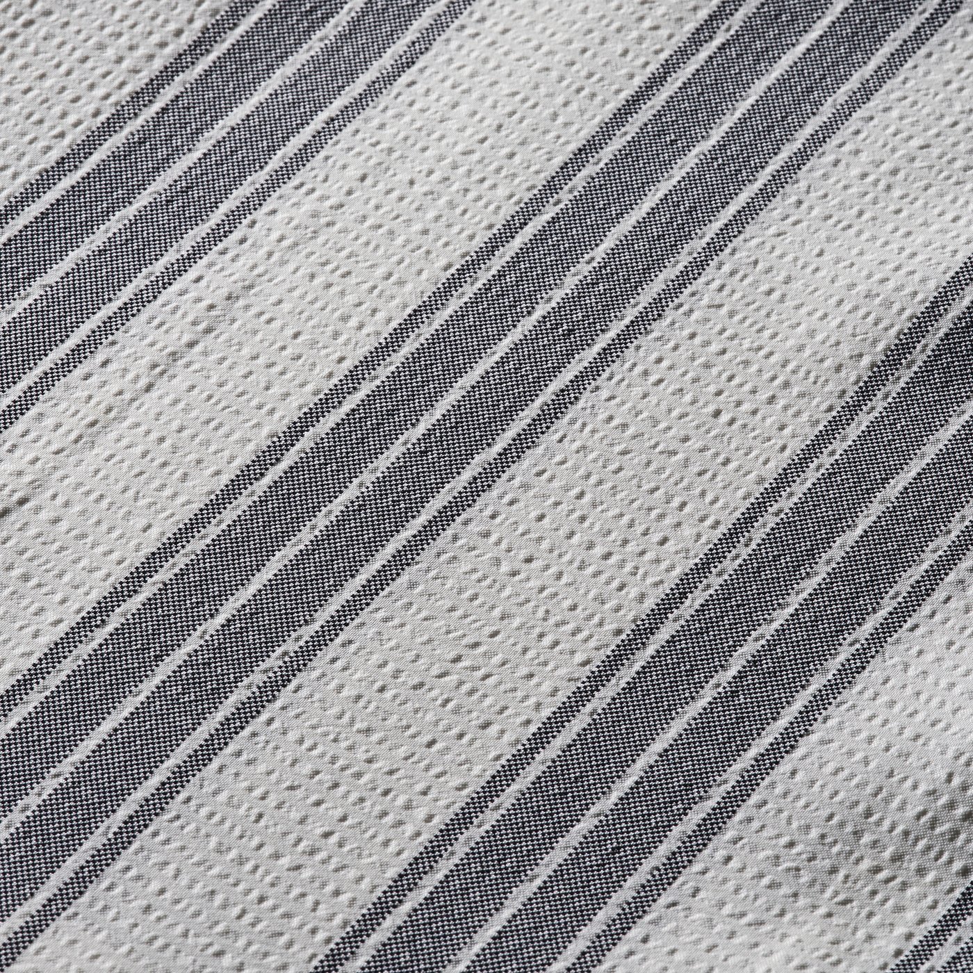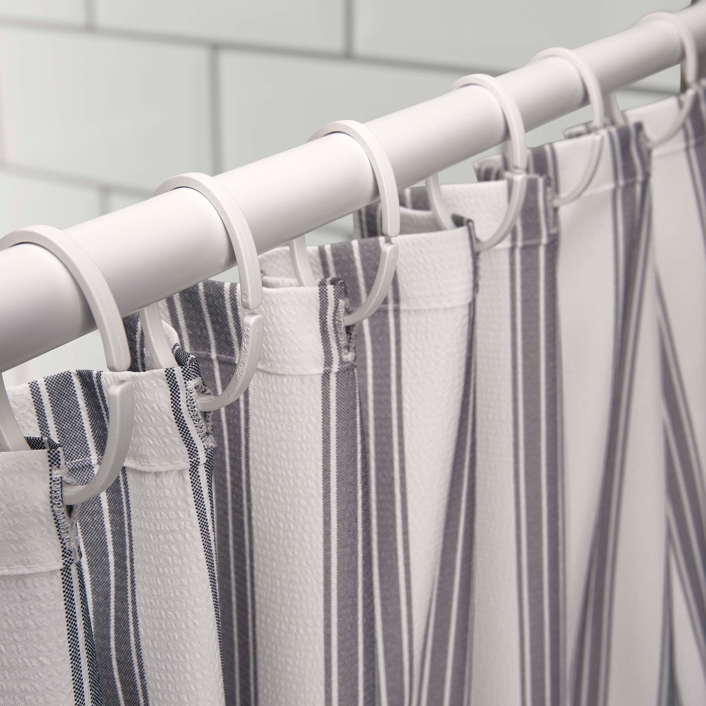 The shower curtain’s seersucker structure creates a naturally wavy surface reminiscent of a soft fabric.