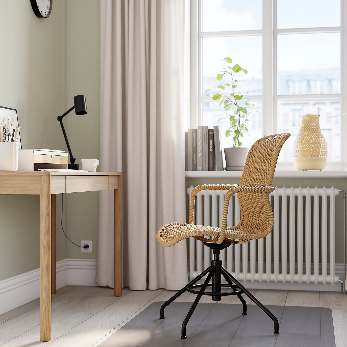 A swivel chair with armrests made of handwoven paper twine, a living material that makes each one unique. A favorite throughout the home, not just by the desk – a great way to invite nature into the home.