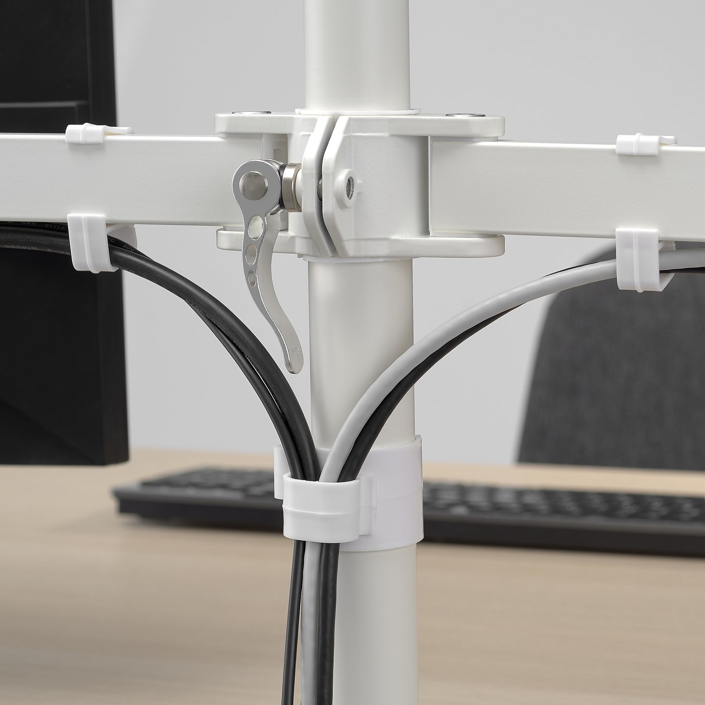 You fix the cables neatly and tidily along the arms and pole by using the included clips.