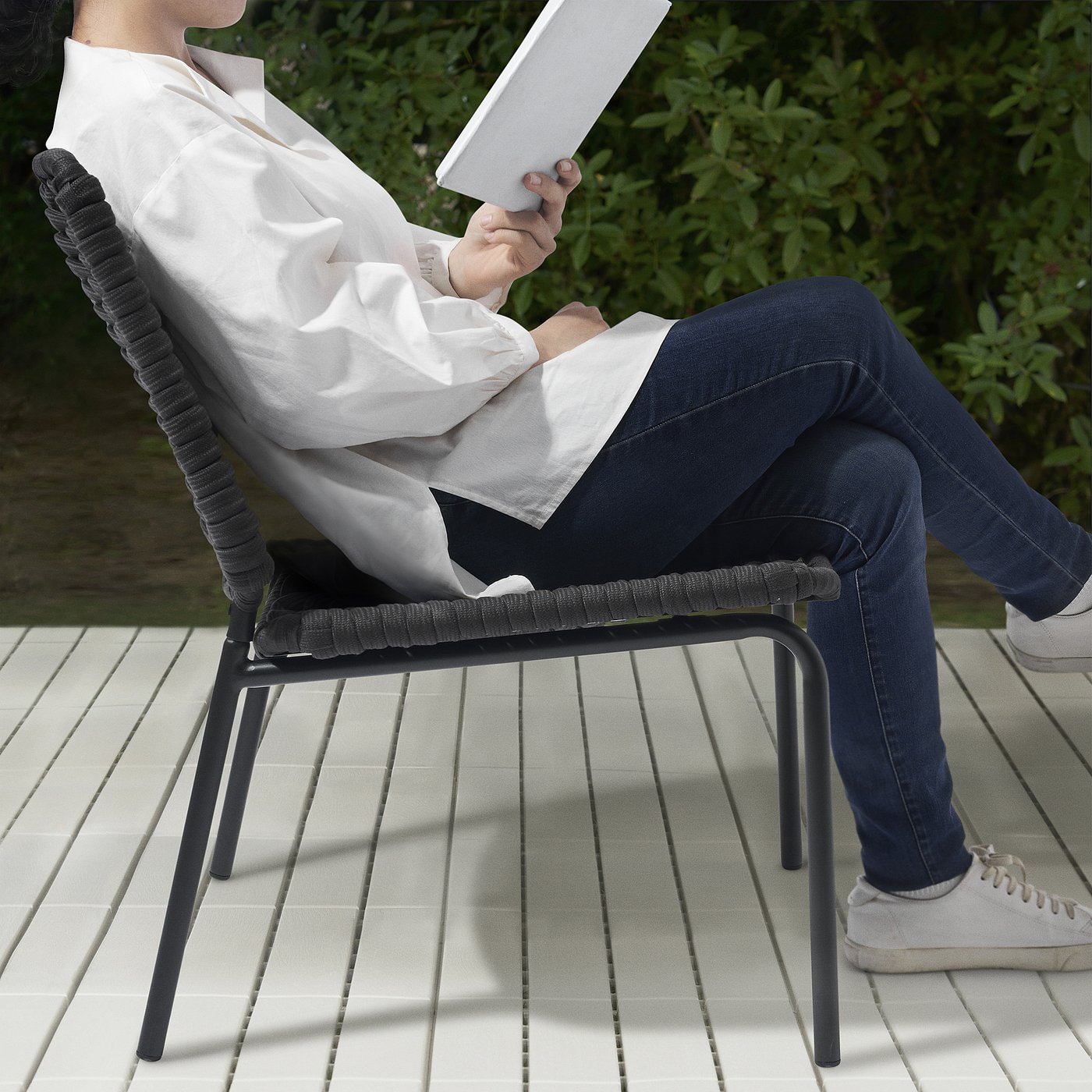 The weaved and flexible textile rope seat gives the chair an expression that goes just as well outdoors as indoors.