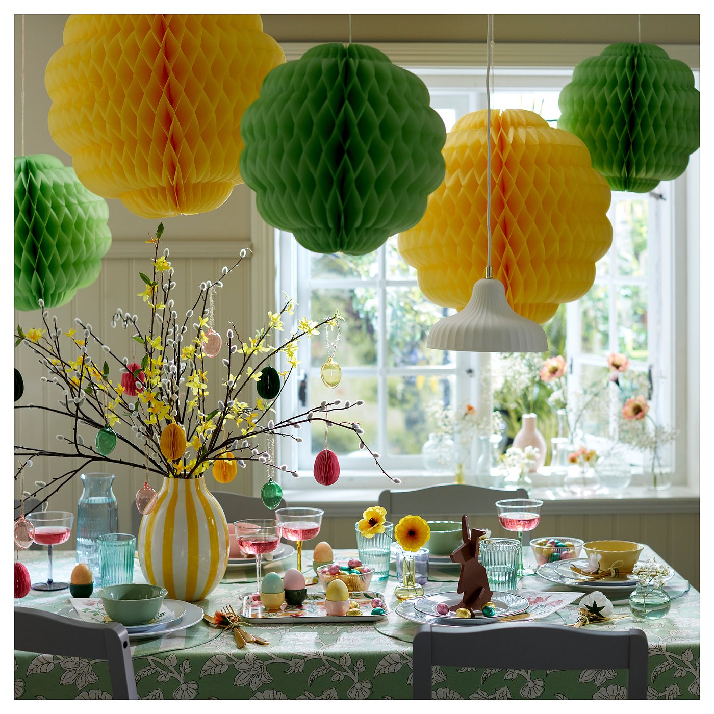 These hanging pom-pom decorations in a variety of colors and sizes let the party bloom in style! Hang them wherever you like – the honeycomb-style folded paper makes them just as lovely from all angles.