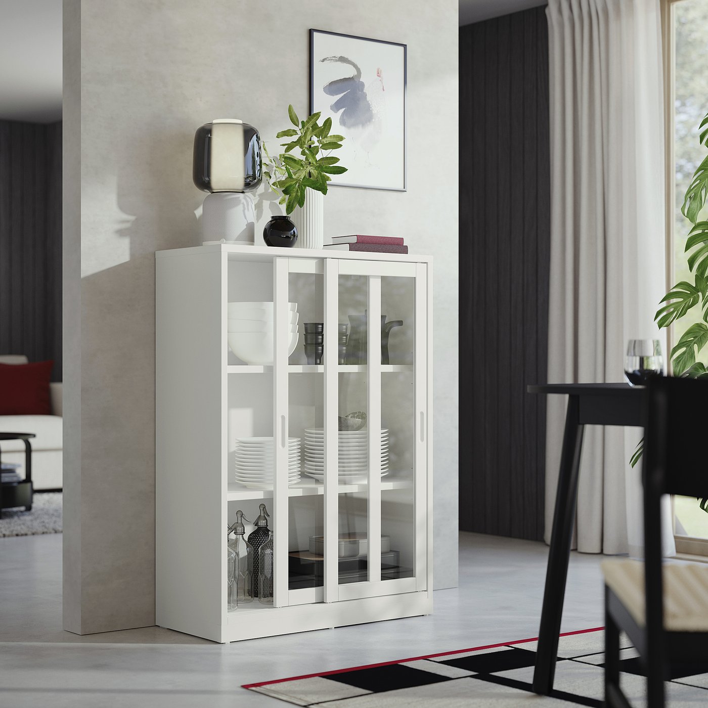 Classic design meets a graceful finish in the TONSTAD series in off-white, giving the furniture a solid sense of quality. A showcase for your finest things, keeping them safe and dust-free – and the sliding doors don’t take up any space when open.