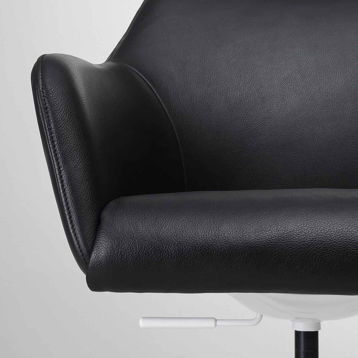 Swivel chair with a soft shape and nice padding. Upholstered in durable leather that blends well in all types of rooms, and with castors that make it easy to move.