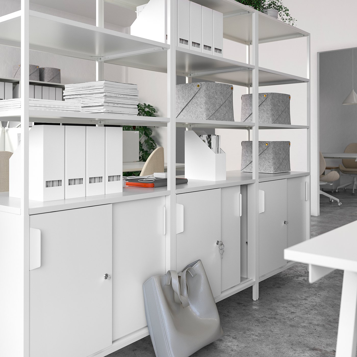 TROTTEN double-sided cabinet with open and closed storage is accessible from both sides – perfect as a room divider. You can create a workshop space by mounting TROTTEN notice board to the cabinet.