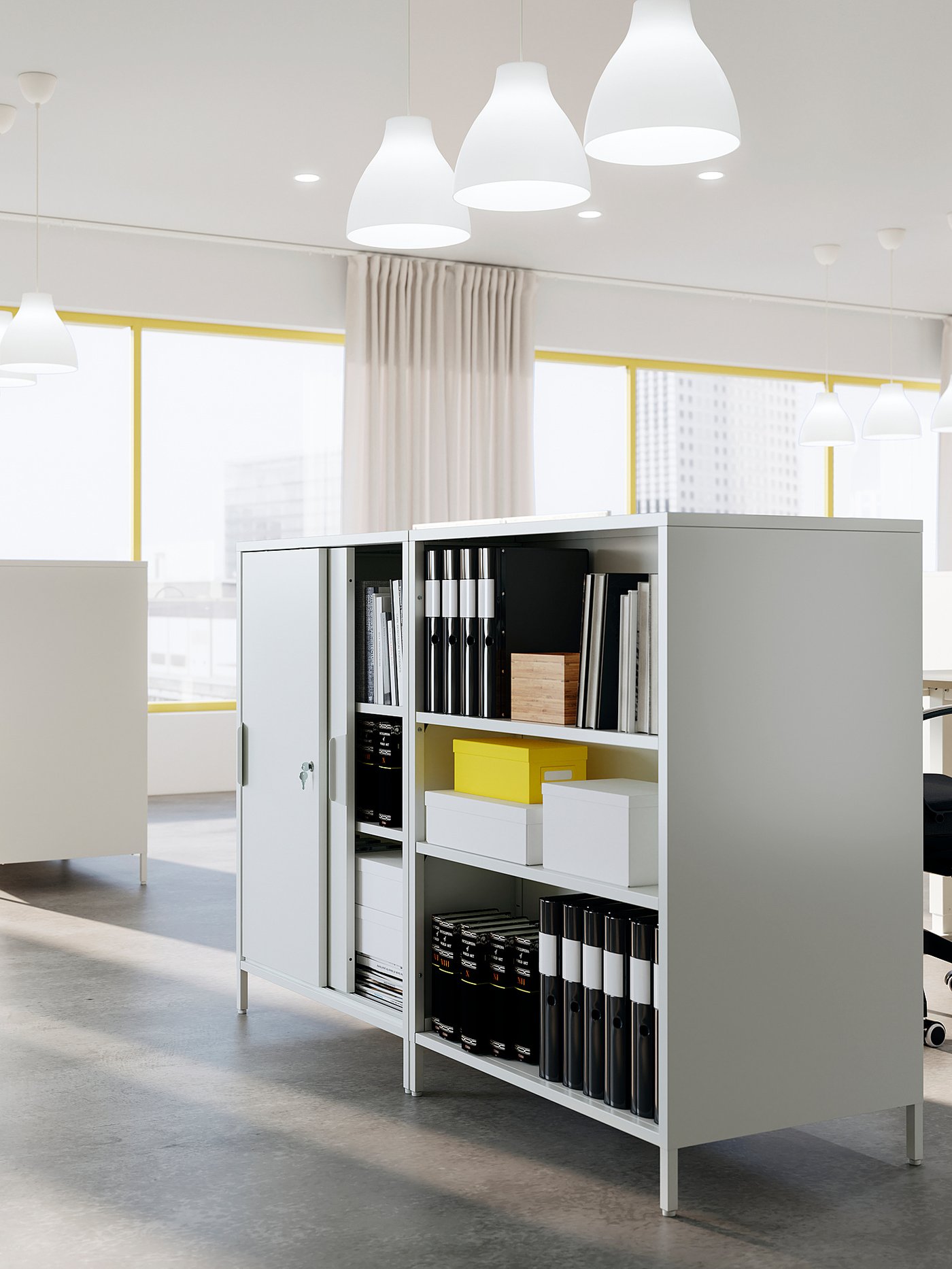 The freestanding cabinet is perfect to use as a divider between different activities in the same room. Creates privacy without blocking the workspace entirely and is great for small and large areas.