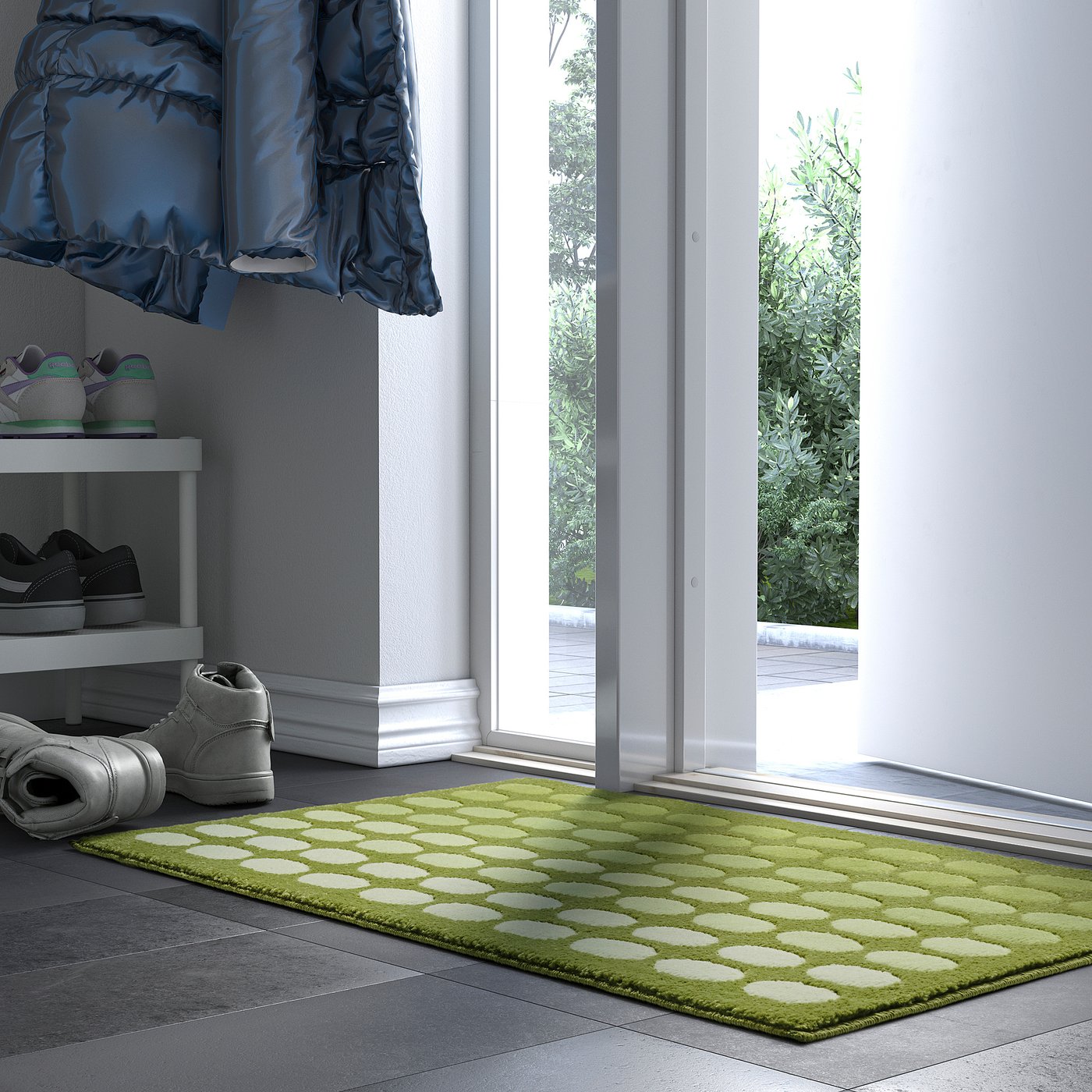 The lovely green color of the door mat creates a fresh impression when guests enter your home.