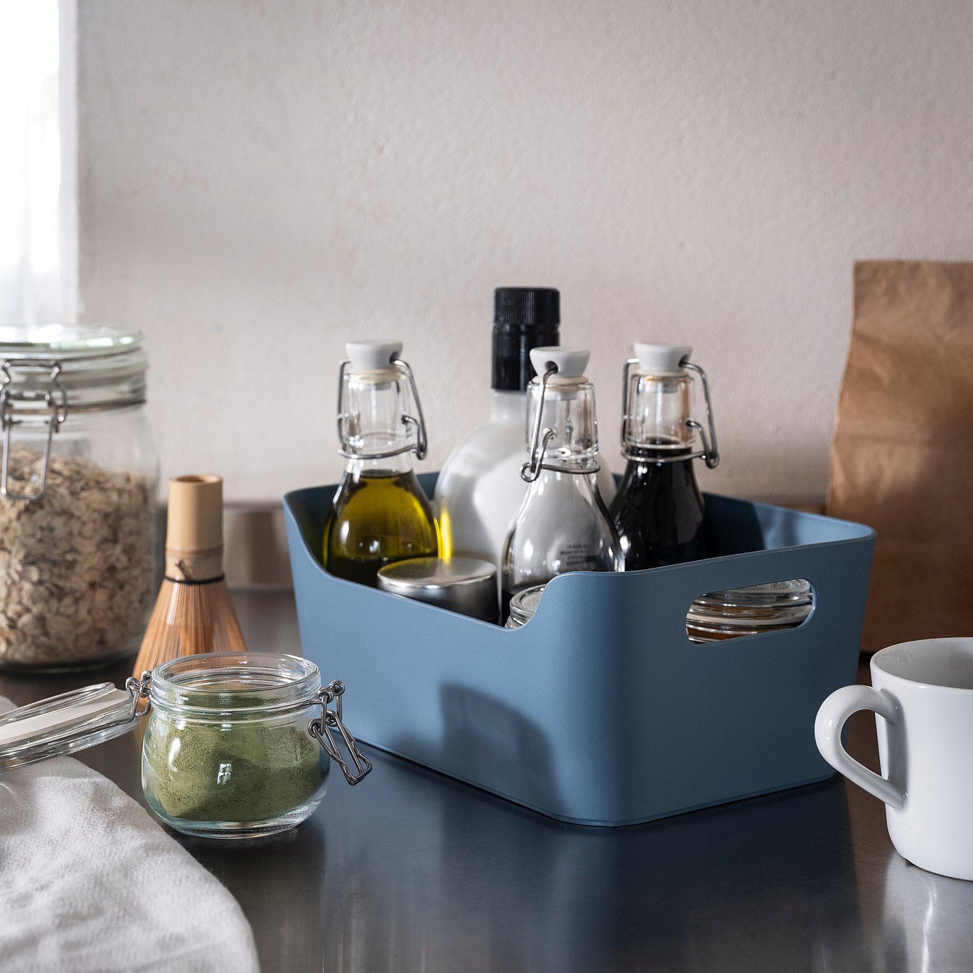 This multi-use box with matt surface is handy for storing and organizing smaller things – and bringing them with you wherever needed. Keep it in a cabinet, on a worktop or anywhere you want at home.
