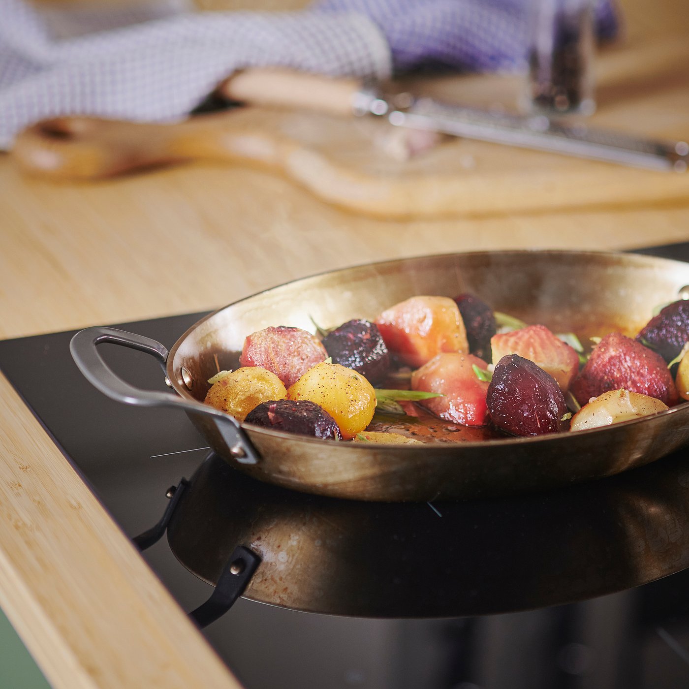 Made from carbon steel, which spreads heat evenly, keeps the pan warm for a long time, and gives food an even browning.