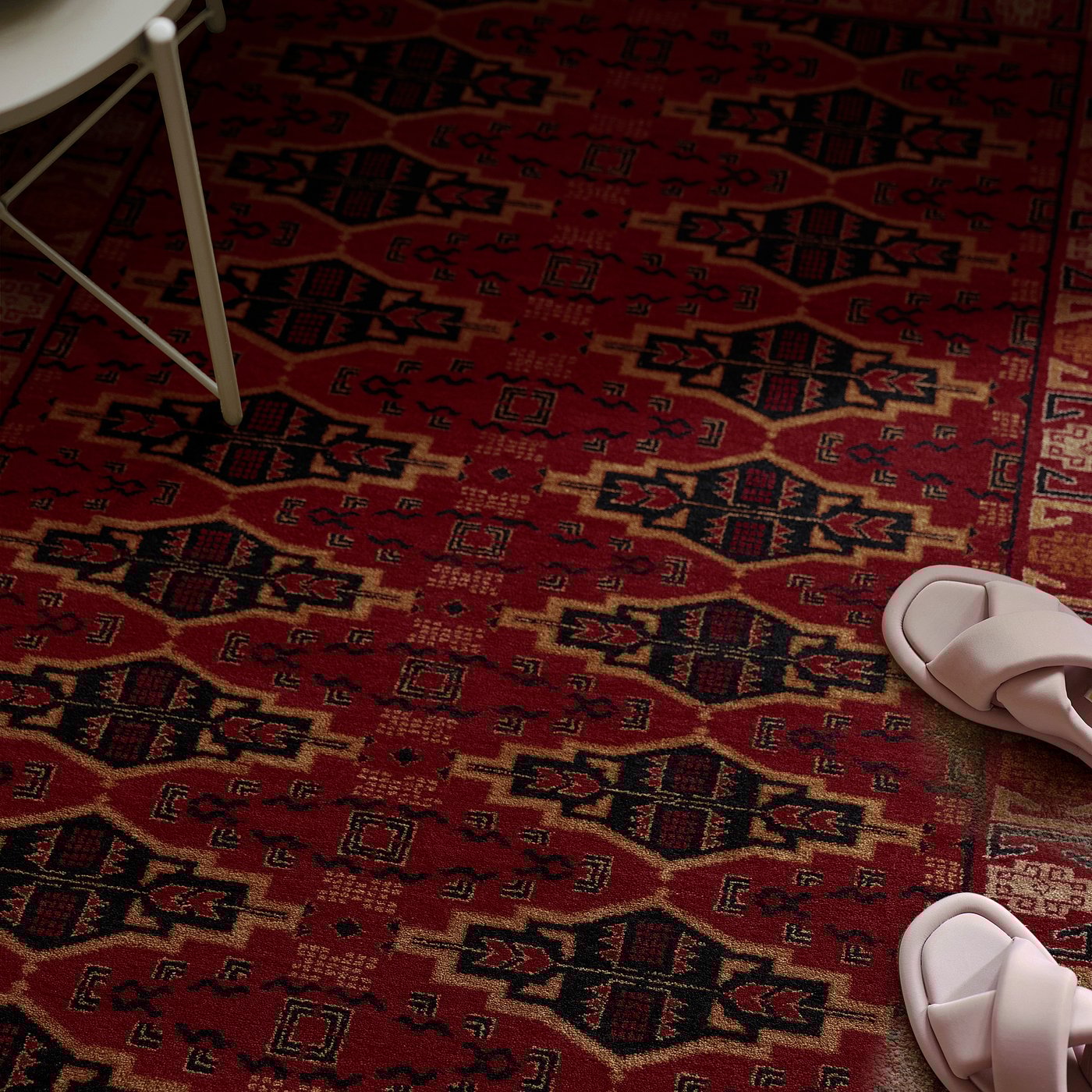 Each rug is a unique, hand-knotted work of art adorned with bold geometric patterns in warm tones inspired by traditional Afghan artistry. Owns its place and adds an elegant touch to your living room.